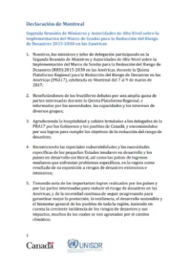 Declaración de Montreal. Segunda Reunión de Ministros y Autoridades de Alto Nivel sobre la Implementación del Marco de Sendai para la Reducción del Riesgo de Desastres 2015-2030 en las Américas. Montreal. Del 7 al 9 de marzo de 2017