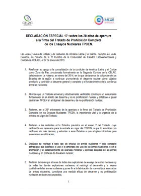 Declaración especial 17: sobre los 20 años de apertura a la firma del Tratado de Prohibición Completa de los Ensayos Nucleares TPCEN. IV Cumbre CELAC