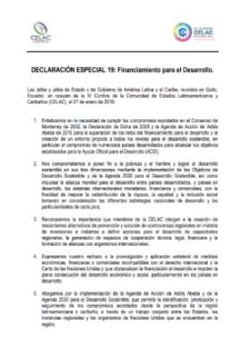 Declaración especial 19: Financiamiento para el Desarrollo. IV Cumbre CELAC