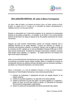 Declaración especial 20: sobre la Banca Corresponsal. IV Cumbre CELAC