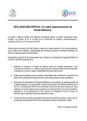 Declaración especial 12: sobre reestructuración de Deuda Soberana. IV Cumbre CELAC