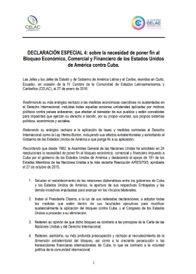 Declaración especial 4: sobre la necesidad de poner fin al Bloqueo Económico, Comercial y Financiero de los Estados Unidos de América contra Cuba. IV Cumbre CELAC