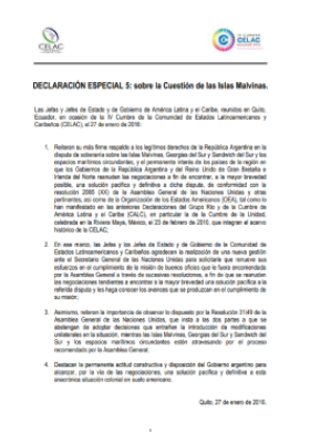Declaración especial 5: sobre la cuestión de las Islas Malvinas. IV Cumbre CELAC
