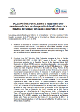 Declaración especial 6: sobre la necesidad de crear mecanismos efectivos para la superación de las dificultades de la República del Paraguay como país en desarrollo sin litoral