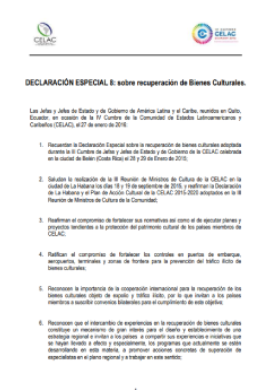 Declaración especial 8: sobre recuperación de Bienes Culturales. IV Cumbre CELAC