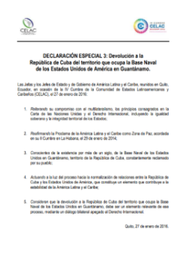 Declaración especial 3: Devolución a la República de Cuba del territorio que ocupa la Base Naval de los Estados Unidos de América en Guantánamo