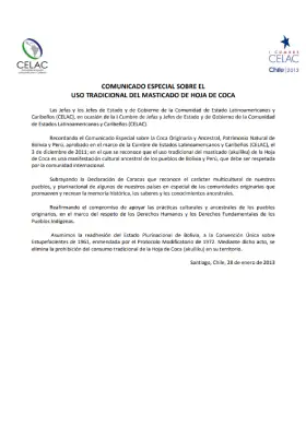 Comunicado especial sobre el uso tradicional del masticado de la hoja de coca