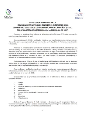 Resolución adoptada en la I Reunión de Ministros de Relaciones Exteriores de la Comunidad de Estados Latinoamericanos y Caribeños (CELAC) sobre cooperación especial con la República de Haití