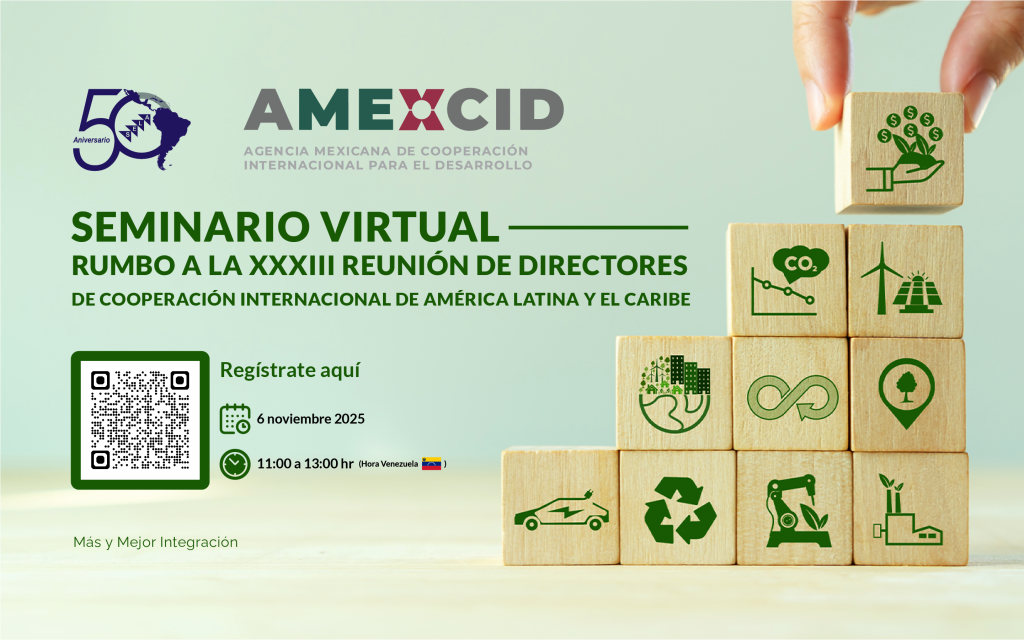 El webinar “Rumbo a la XXXIII Reunión de Directores de Cooperación Internacional” se realizará vía Zoom y está dirigido a directores de cooperación internacional de América Latina y el Caribe, agencias de cooperación, especialistas e investigadores en materia de CSSyT y economía circular.